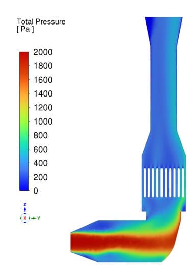 Результаты CFD‑моделирования показали, что суммарные потери полного давления при прохождении газа через выхлопную систему составляют около 1300 Па, что превышает допустимое нормативное значение в 1000 Па.