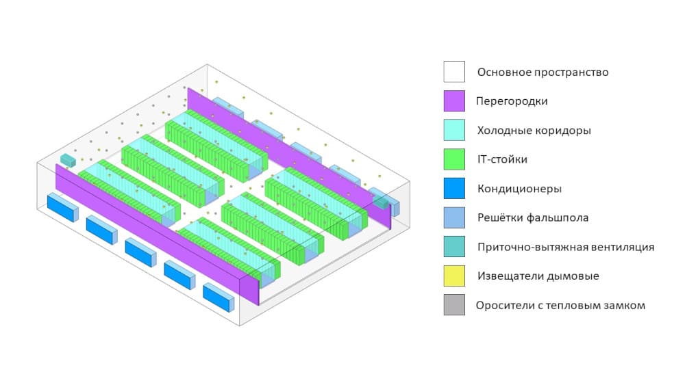 Система охлаждения организована по принципу изоляции холодных коридоров, как показано на рисунке ниже.