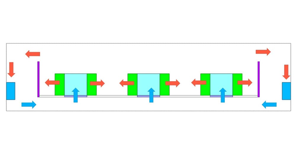 Поскольку работа кондиционеров не останавливается при возгорании, к горящей стойке и соседним с ней продолжает поступать холодный воздух. Проходя через стойки, близкие к горящей, холодный воздух разбавляет поток горячего воздуха и дымовых газов. В результате воздух, доходящий до оросителей, не достигает необходимой для их срабатывания температуры.
