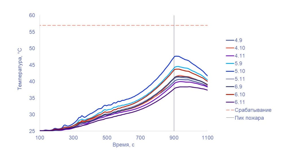 Как видно из графика, ни один из оросителей не срабатывает во время пожара; максимальная температура на оросителях составляет 48 °С, тогда как для срабатывания необходимо достижение 57 °С. После того, как проходит момент пикового тепловыделения, температура на оросителях в течение примерно 20 секунд остаётся постоянной, а затем начинает убывать.