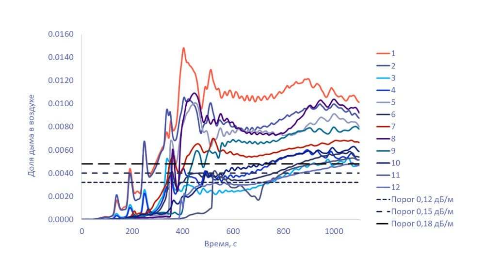 При низком пороге срабатывания дымовые извещатели срабатывают спустя 3 минуты после начала возгорания, при высоком пороге – спустя 4 минуты. На рисунках ниже дымовые датчики отмечены в порядке срабатывания и приведён график зависимости концентрации дыма вблизи оросителей от времени.