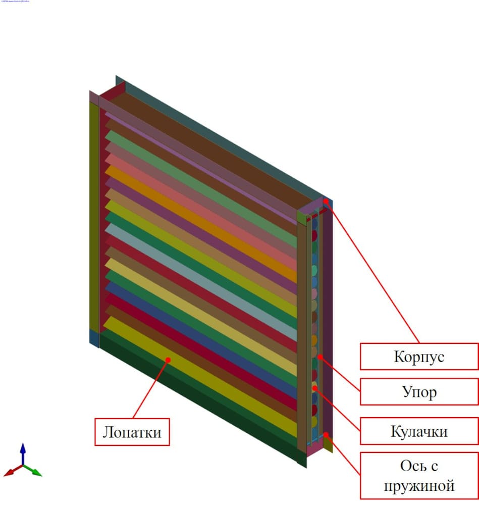 При воздействии ВУВ лопатки приводятся в движение и передают крутящий момент на кулачки, которые толкают упоры. Упоры движутся вдоль осей, сжимая пружины. После снижения давления пружины обеспечивают возврат всего механизма в исходное положение. Для корректного моделирования работы клапана необходимо учитывать взаимодействие всех составных частей.