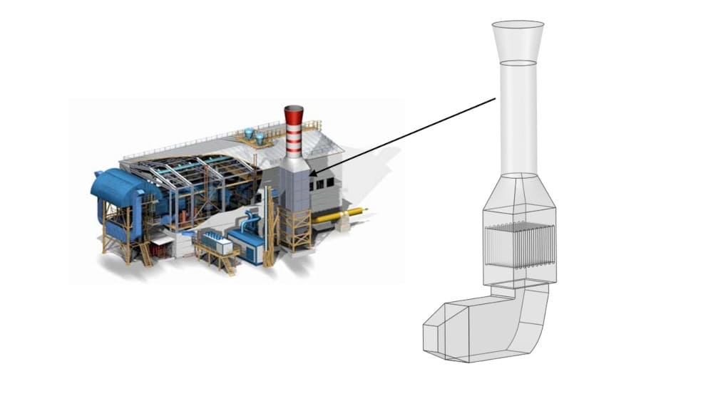 Проточный тракт системы выхлопа создаёт газодинамическое сопротивление, напрямую влияющее на полезную мощность газотурбинной установки (ГТУ). Специалисты АО «ЦИФРА» с помощью компьютерного моделирования провели анализ конструкции системы выхлопа. Виртуальные испытания показали, что газодинамическое сопротивление проточного тракта превышает рекомендуемое значение. С помощью компьютерного моделирования были разработаны конструктивные решения, которые позволили обеспечить выполнение требований нормативной документации.