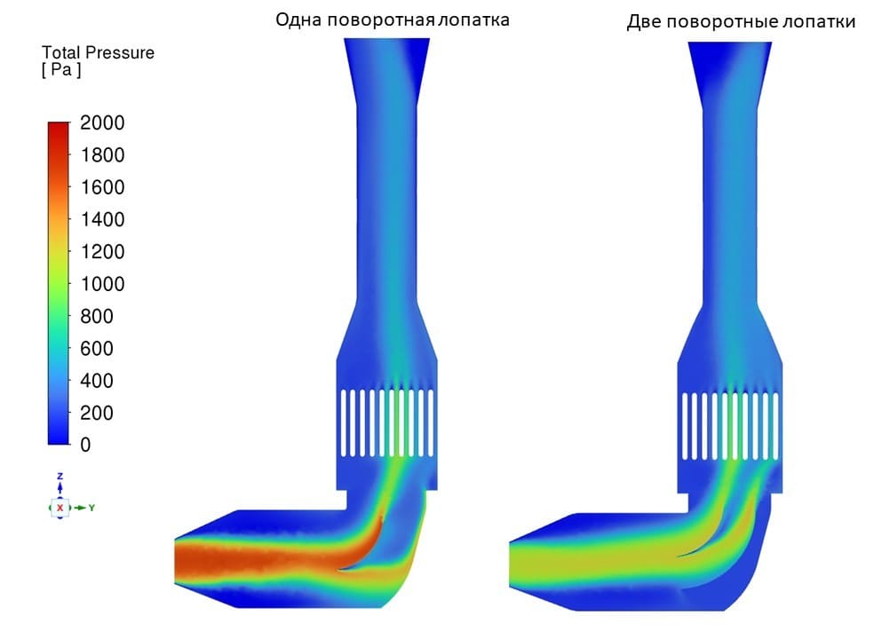 В результате оптимизации конструкции проточного тракта выхлопной системы было достигнуто значительное снижение газодинамического сопротивления. Потери полного давления в модернизированных конфигураций снизились до значений, не превышающих 1000 Па, что полностью соответствует требованиям СТО ГАЗПРОМ 2‑3.5‑138‑2007. В случае двух поворотных лопаток значение перепада давления составило 807 Па, а в случае одной лопатки 927 Па, что также удовлетворяет требованиям СТО.