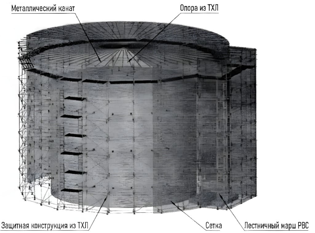 Рисунок 2 – Типовое решение ЗОК на независимом каркасе из строительных лесов с использованием сеток и металлических канатов без противоосколочных элементов для защиты резервуаров вертикальных стальных (РВС)