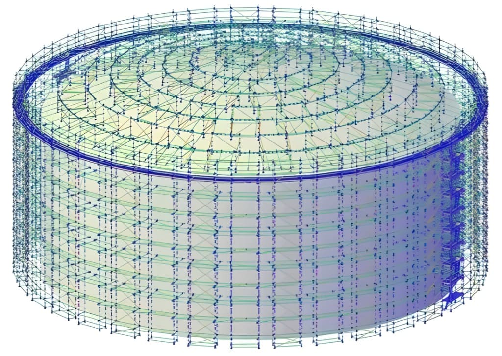 АО «ЦИФРА» выполняет проектирование и поверочные расчёты прочности и устойчивости защитных ограждающих конструкций для резервуаров на климатические воздействия по СП 20.13330.2016. Нагрузки и воздействия и нагрузки от падения беспилотного летательного аппарата согласно СП 542.1325800.2024. Защитные ограждающие конструкции от беспилотных летательных аппаратов.