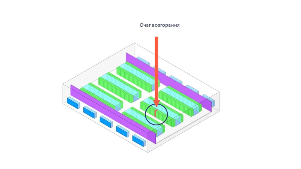 Поскольку работа кондиционеров не останавливается при возгорании, к горящей стойке и соседним с ней продолжает поступать холодный воздух. Проходя через стойки, близкие к горящей, холодный воздух разбавляет поток горячего воздуха и дымовых газов. В результате воздух, доходящий до оросителей, не достигает необходимой для их срабатывания температуры.