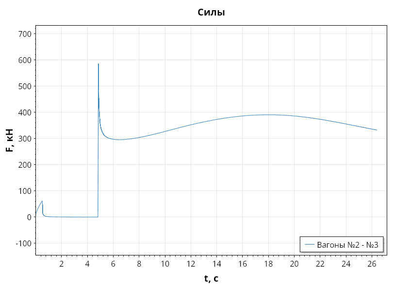 Пример расчёта усилий в автосцепке между вагонами приведён на рисунке ниже.